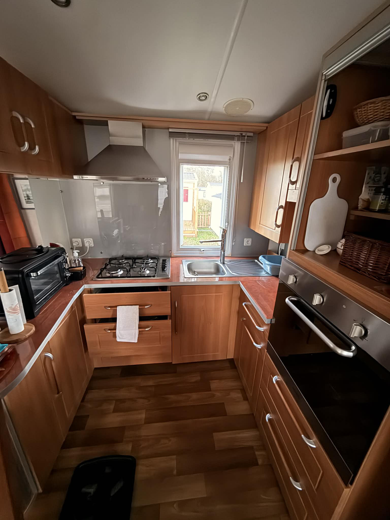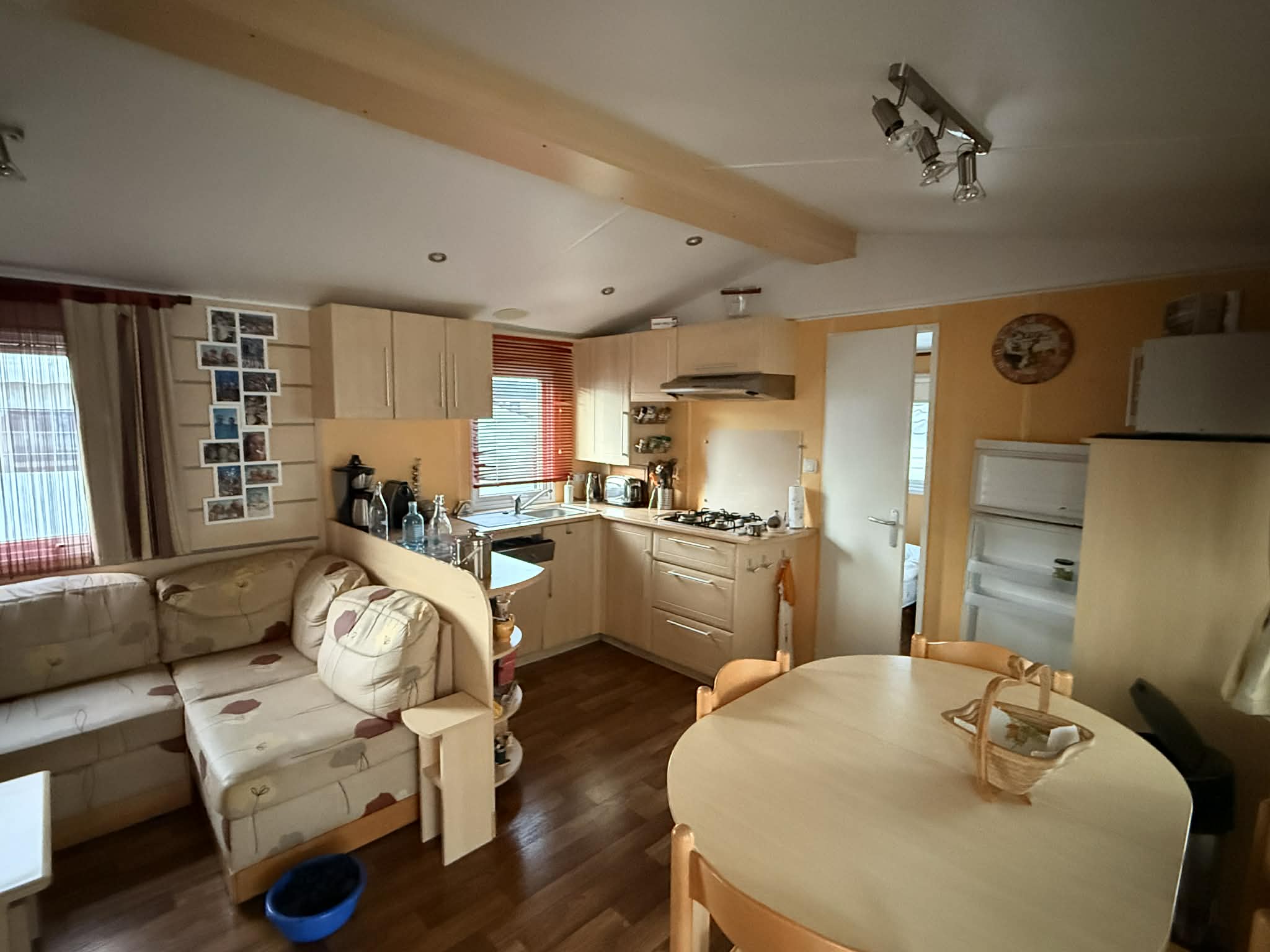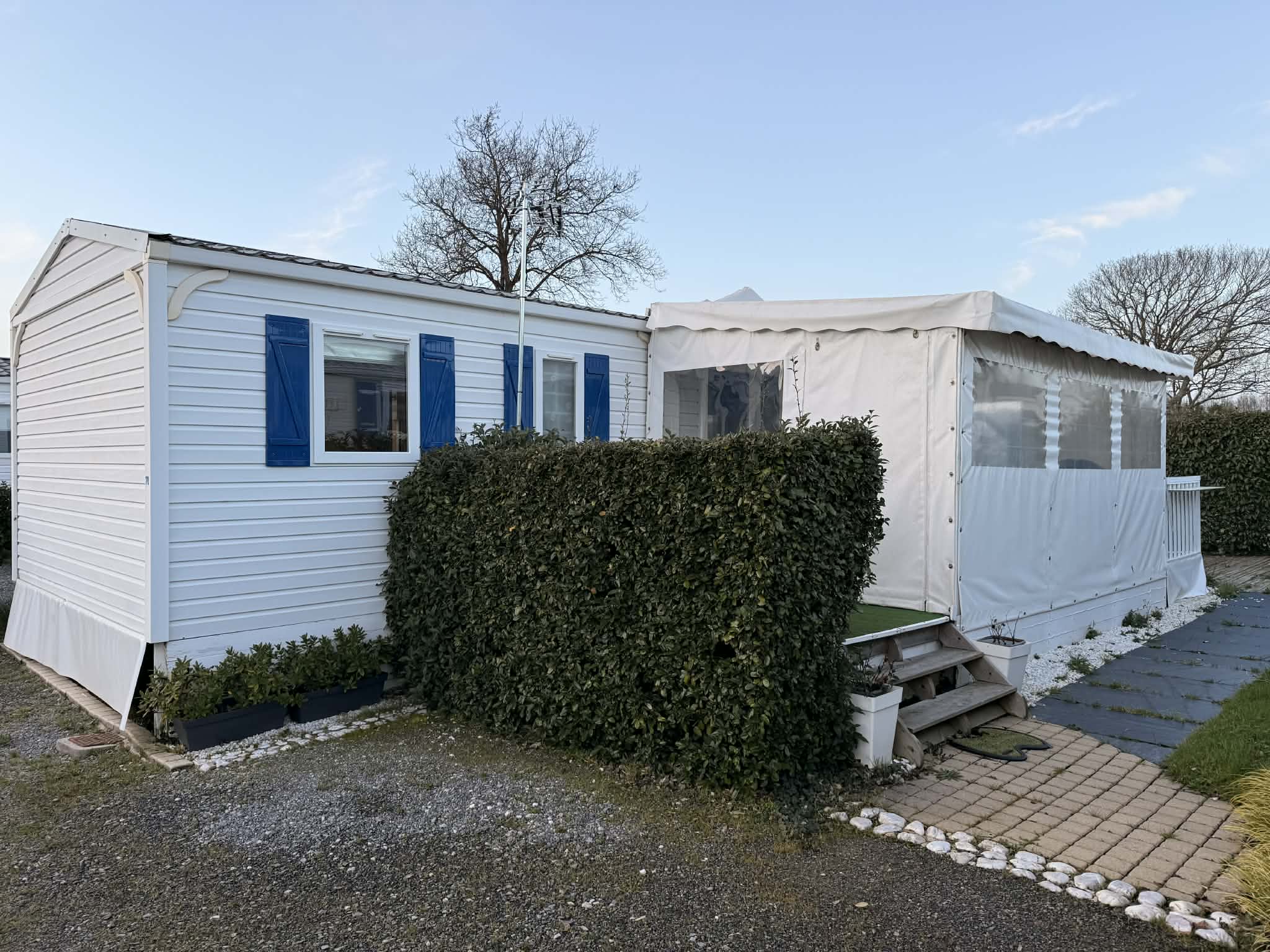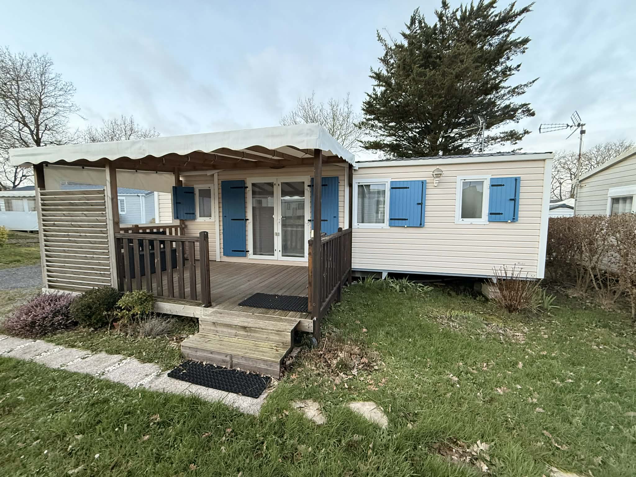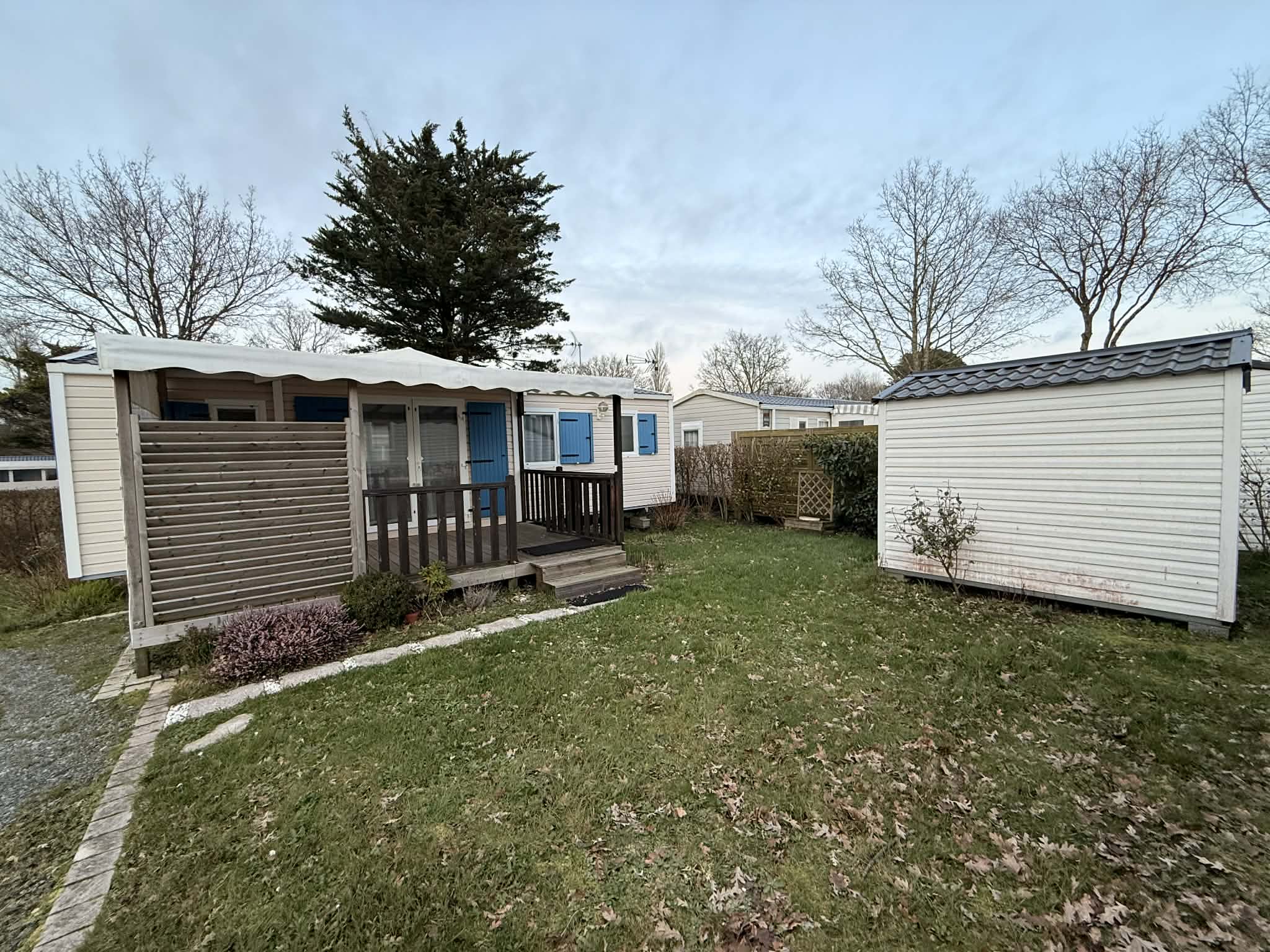 Il est vendu sur une parcelle de 400m² avec cabanon, location de l’emplacement pour 2026 : 4857€, eau et électricité en sus avec sous compteurs individuels